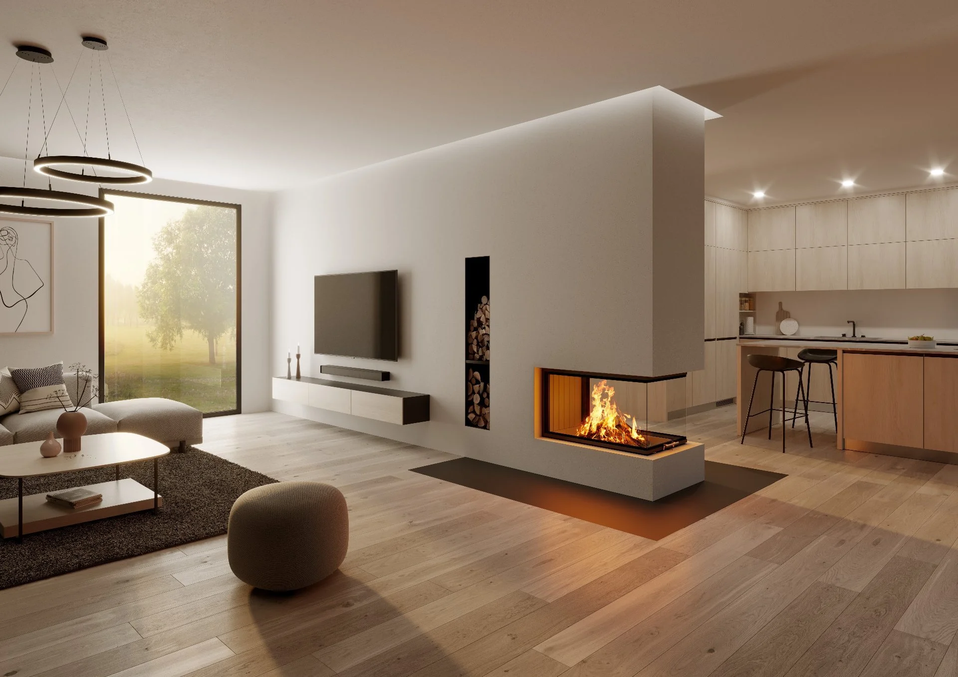 Großflächige Verglasung, Flammenbild im Fokus, ideal für offene, moderne Wohnkonzepte.